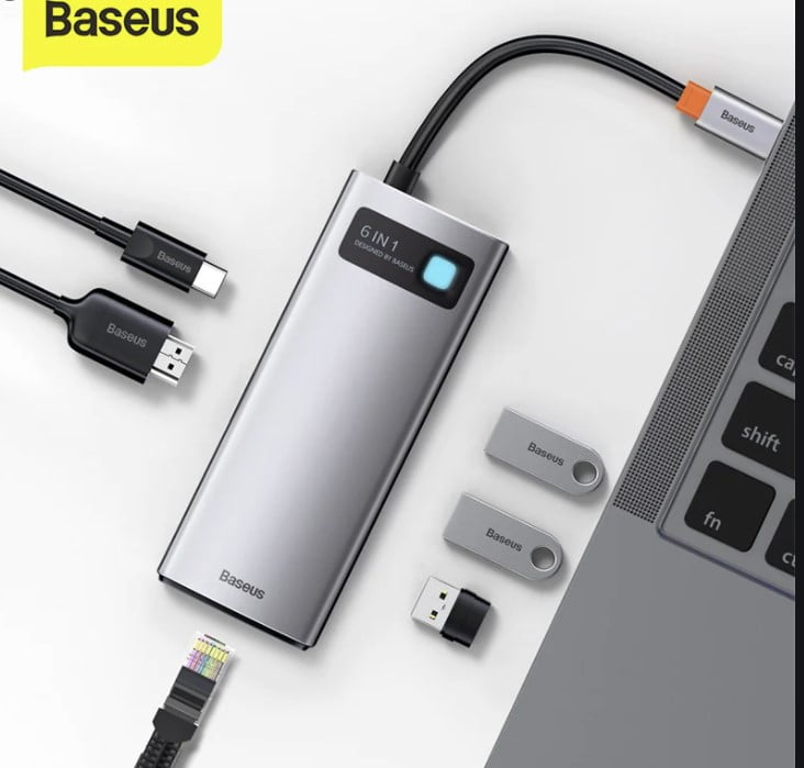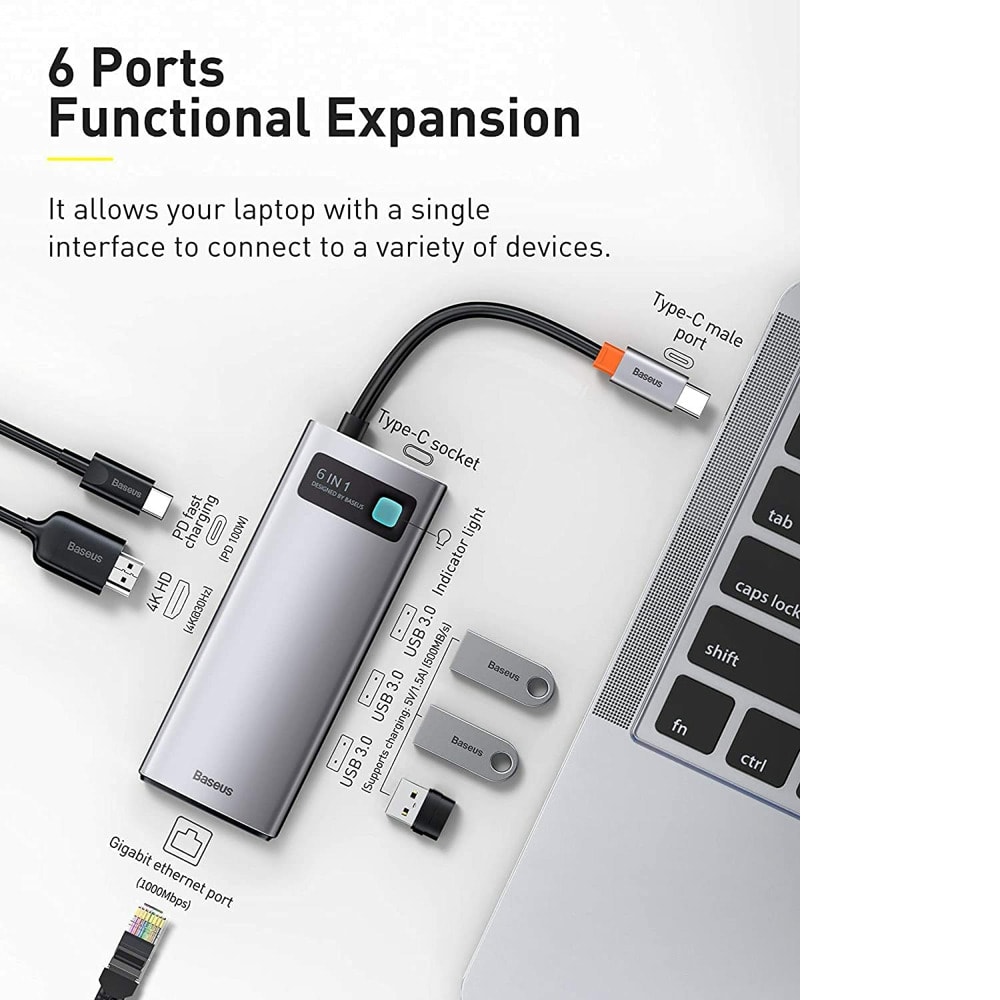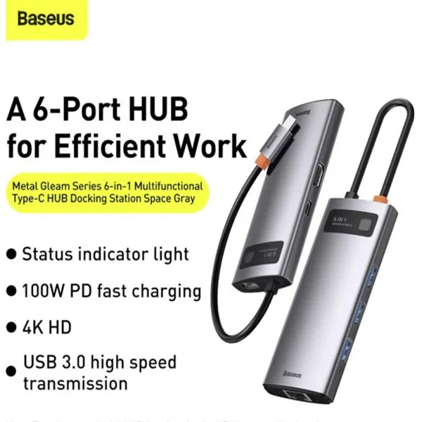 Buy Baseus Metal Gleam Series 6-in-1 Multifunctional Type-C HUB Docking Station Gray(Type-C to HDMI*1+USB3.0*3+PD*1+RJ45*1) available at mybrandstore.pk