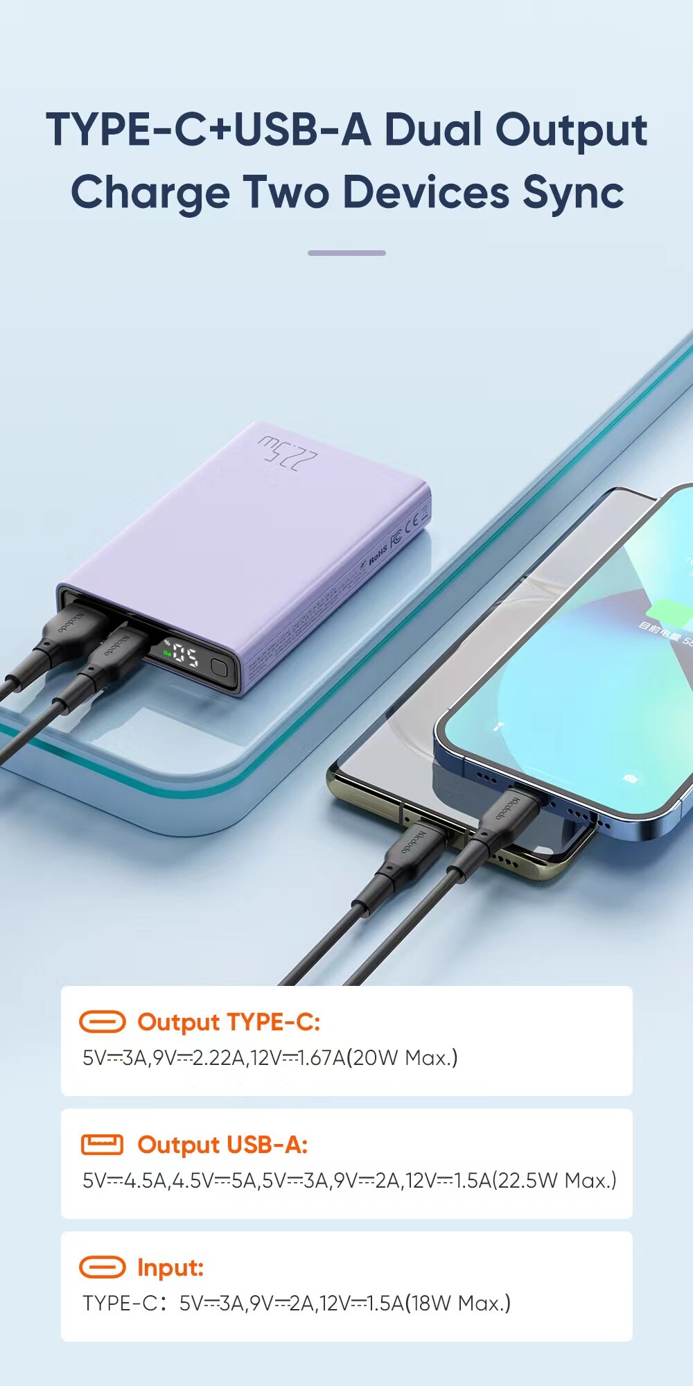 - Smart 9 in 1 fast charging with PD3.0, QC3.0, FCP, AFC, SCP, SFCP, VOOC, MTKPE2.0, BC1.2;