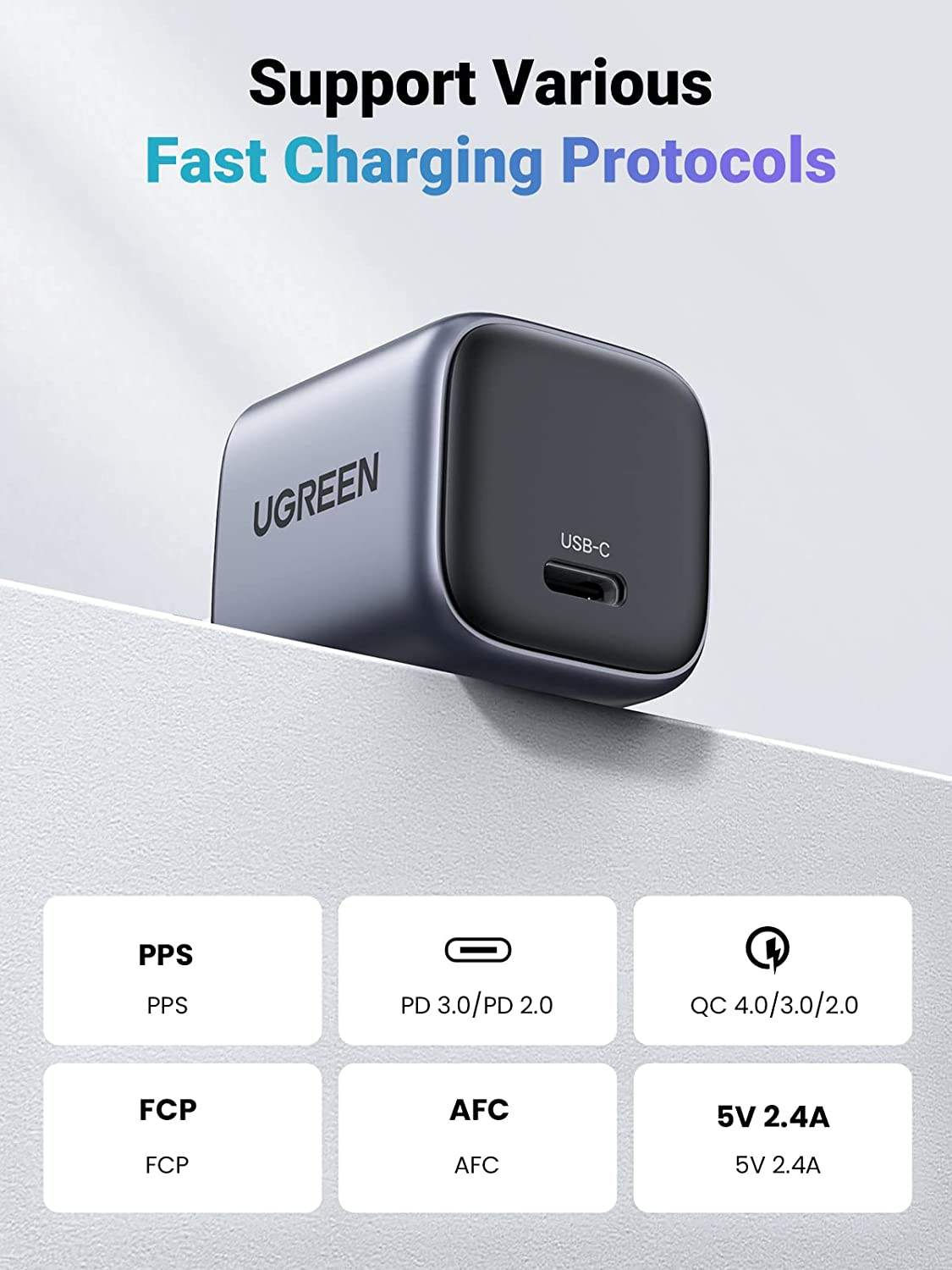 Perfectly compatible with iPhones, Android phones, iPads, MacBooks, earbuds, and more, the UGREEN 30W charger supports PD3.0, QC4.0, and PPS protocols, making it an ideal all-in-one charger for home, office, or travel. The durable Space Grey aluminum shell adds a premium look while helping with heat dissipation.
